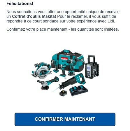 Vous avez certainement déjà reçu ce genre de mail : "Nous souhaitons vous offrir une opportunité unique de recevoir un Coffret d'outils Xxx! Pour le réclamer, il vous suffit de répondre à ce court sondage sur votre expérience avec Yyyy. Confirmez votre place maintenant - les quantités sont limitées." C'est tentant et l'on est invité à faire vite. Ce serait bête de manquer une telle occasion. Bien sûr c'est un piège.
