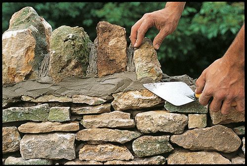 • Noyez des crampons métalliques espacés au maximum de 90 cm dans le plan horizontal et de 45 cm dans le plan vertical. Comblez l’espace médian avec du mortier chargé de débris de pierres. Pour le haut du mur, étalez du mortier sur la totalité des pierres et posez des pierres à la verticale et en alternant leur grosseur. Avant que le mortier ne soit complètement sec, ôtez le surplus avec une truelle et brossez les pierres avec une brosse.