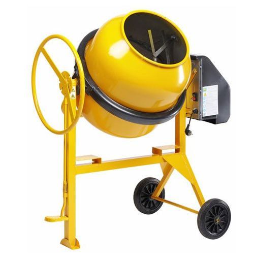 La bétonnière permet de malaxer environ 125 l de béton en 3 minutes (pour les modèles courants). Le chargement de la cuve doit se faire avec méthode : d’abord le sable et les graviers, puis le ciment, et l’eau en dernier. On charge à l’aide d’une pelle après avoir effectué les dosages.