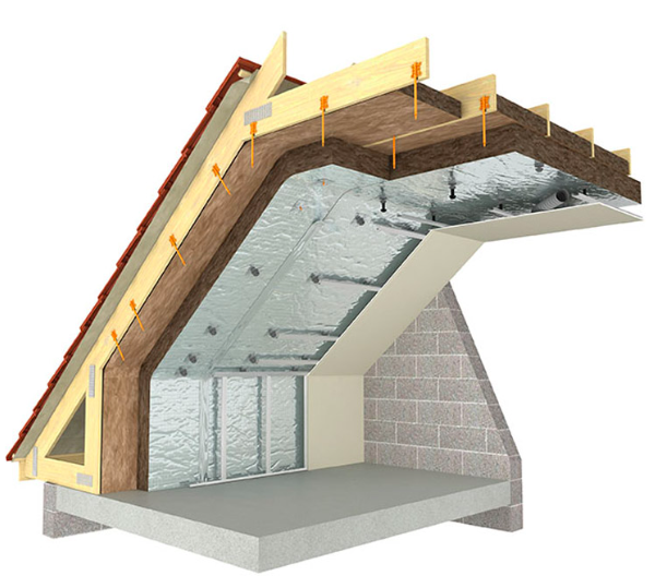 Elle dépend de l’état des chevrons comme du climat. Si les chevrons sont épais, placez des panneaux de laine de verre semi-rigides entre eux et fixez directement les plaques par vissage. Cette fixation directe sur chevrons ne convient que pour une isolation dans une région à climat doux, car la couche de laine de verre est peu importante. Elle présente l’avantage de laisser un maximum d’espace libre (et c’est souvent important dans les pièces mansardées). En outre, elle laisse découvertes les pannes intermédiaires, ce qui donne un cachet appréciable à la pièce.