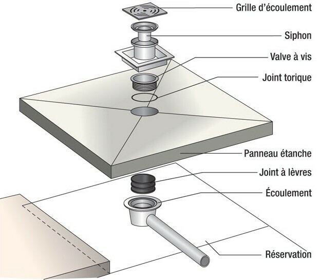 L' évacuation de la douche se fait, via une bonde (l'orifice percé dans la bac, avec ou sans clapet) et un siphon, comme pour une baignoire, par une canalisation en PVC , de 40 ou 50 mm de diamètre, apparente ou encastrée dans le plancher. Pour que le fond du receveur soit au même niveau que le sol ( douche à l'italienne ), il faut donc que le siphon puisse être encastré dans le sol. Sinon, on ne peut installer qu'un receveur à poser, le minimum de profondeur d'un siphon extra-plat étant de 40 mm.